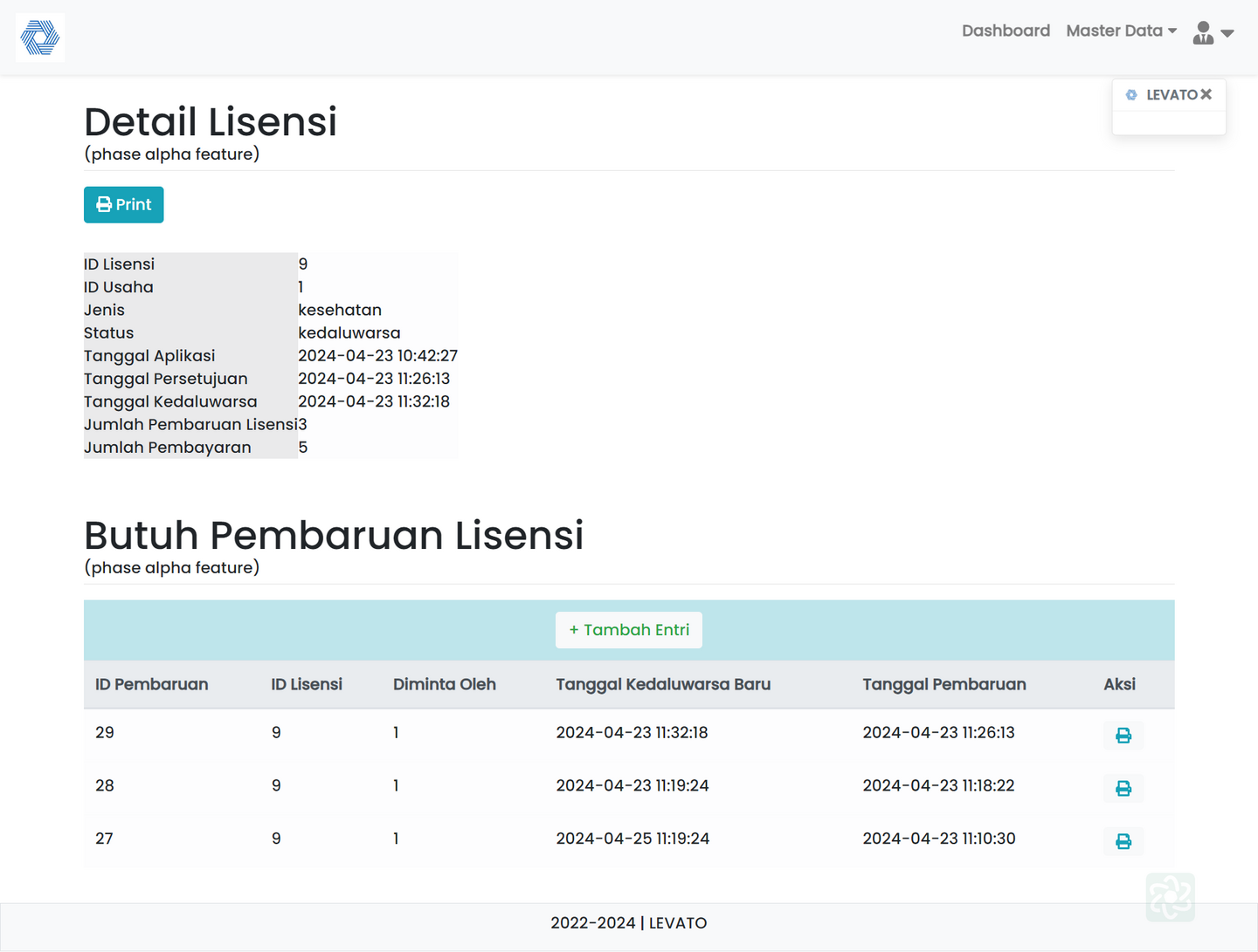 Levato is a prototype website that helps small businesses make business licenses and help them grow.Upcoming Features: Notification system, password rules, website theme management, website security, and more responsive UI for mobile users.Features: Business License Management, Transaction feature, Business License renewal, Two user login systemDevelopment team: Levato Team (Kevin Thionuartha, Mickel, Khenjy Johnelson)